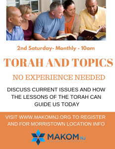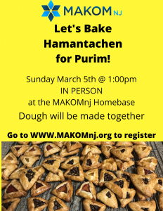 Get to know the MAKOMnj community in a more intimate way at a casual potluck Shabbat dinner.  Dinner is called for 6:30 pm at Rabbi Miller’s home. We begin with the traditional Shabbat blessings and then a delicious meal! MAKOMnj will cook the chicken and bake the challah.